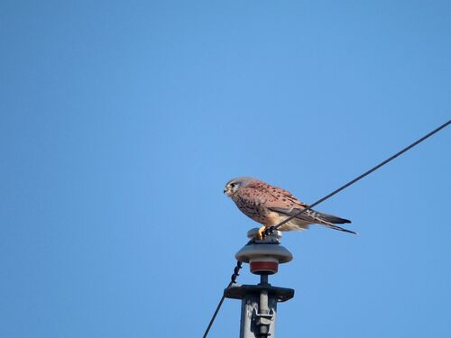 青空に良く映えます♪ 昨日まで北信濃の温泉に行ってきました。帰りの道で電線にとまっているチョウゲンボウを発見。雲一つ無い青空をバックにきれいな色合い、若い♂でしょうか。こちらをちらっと見た後、電柱下の畑に飛び降りトカゲ?をつかんで飛んで行きま…